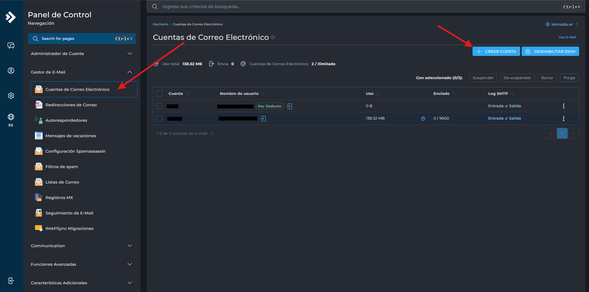 Ir a Gestor de E-Mail > Cuentas de Correo Electrónico y Crear cuenta