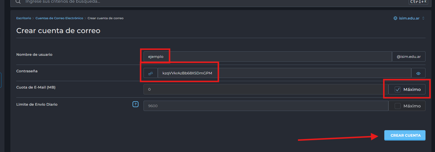 Completar el nombre de usuario, poner contraseña random y marcar "Máximo" en "Cuota de E-Mail".